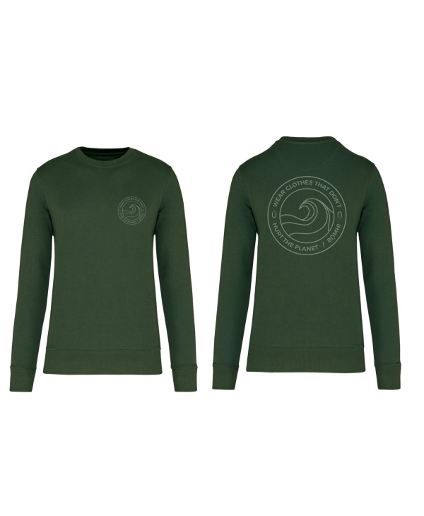 Sudadera 85% algodón orgánico 15% poliéster reciclado postconsumer con diseño ola a todo color.