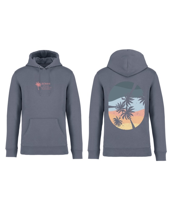 Sudadera unisex con capucha 85% algodón orgánico 15% poliéster reciclado postconsumer con logos delantero y trasero a todo color.